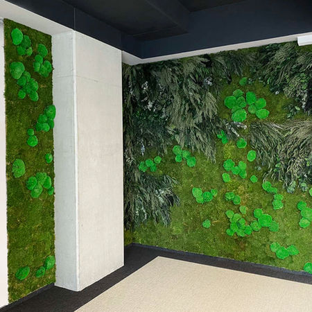 Зелена стена в споделено пространство, изработена от flatmoss, ballmoss и стабилизирани растения.